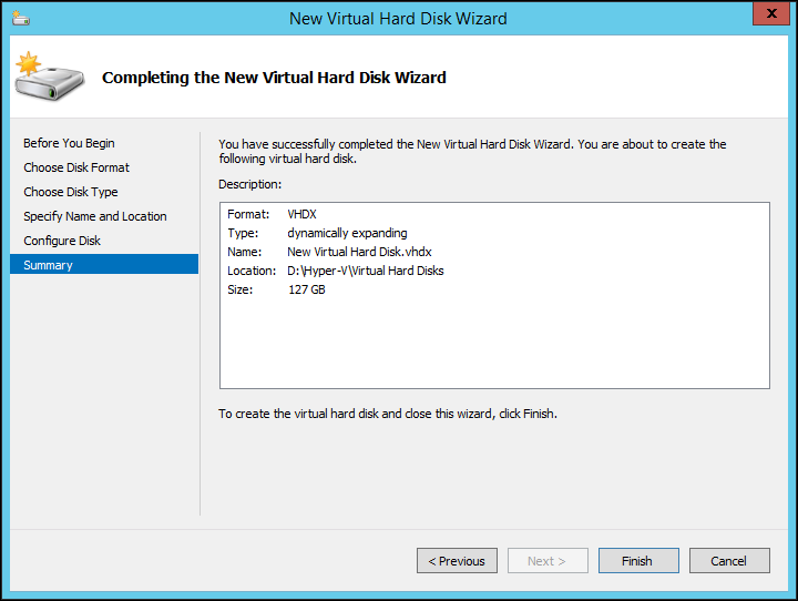 The Completing the New Virtual Hard Disk wizard dialog is displayed, showing the details of the new disk.