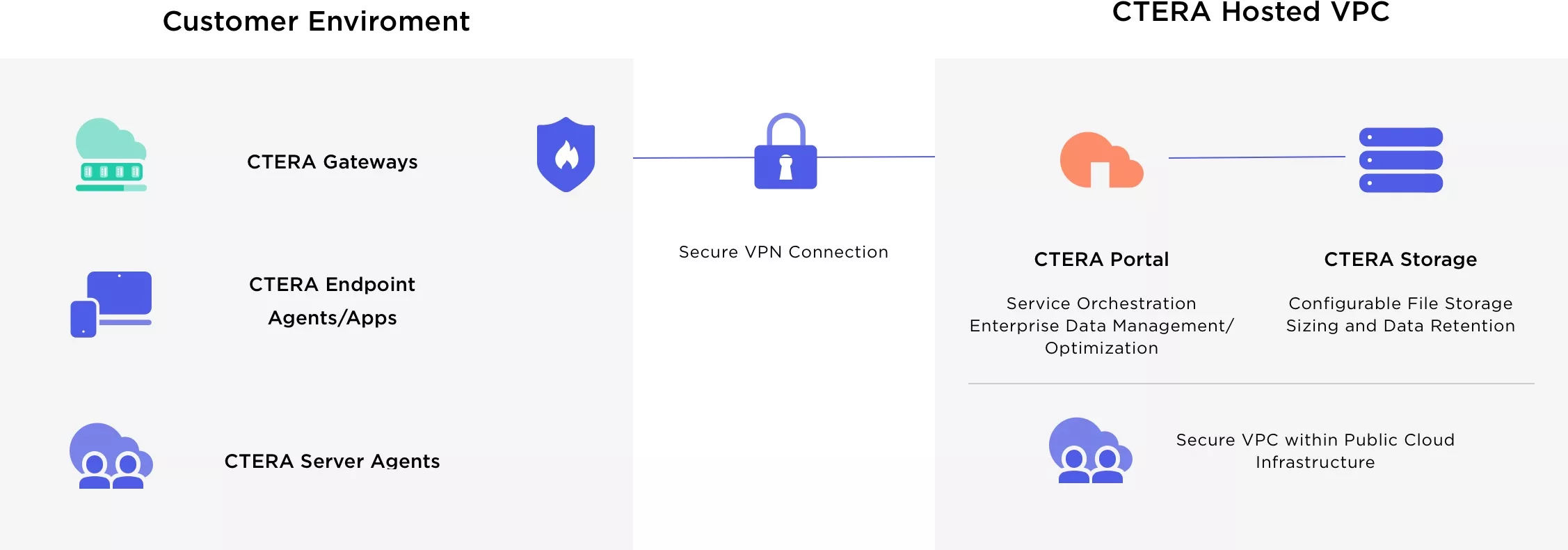 CTERA’s focus has always been to offer the most secure cloud file services platform in the world. CTERA Dedicated Cloud provides enterprises with the ideal high-security complement to our 100% private offering. Unlike traditional SaaS offerings that compromise security by co-mingling customer data, metadata, authentication, and encryption, CTERA Hosted VPC delivers the complete data isolation customers expect from a CTERA-managed service.