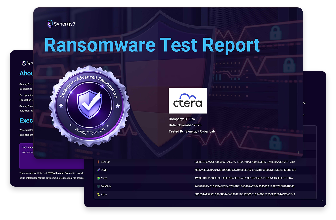 To validate the real-world efficacy of our platform, CTERA commissioned Synergy7 to execute a series of rigorous, simulated ransomware attacks. The objective was to measure the velocity and effectiveness of our defense mechanisms from the moment of infiltration.